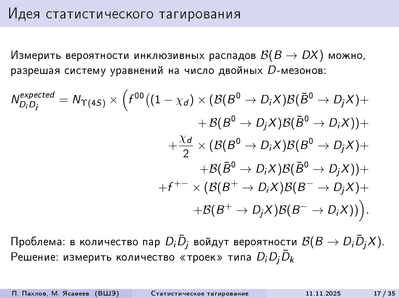На научном семинаре МЛФЭЧ 11 ноября 2025 года аспирант ВШЭ и младший научный сотрудник Мурад Ясавеев выступил с докладом, в котором обсуждался новый метод измерения вероятностей инклюзивных распадов B-мезонов на D-мезоны в экспериментах Belle и Belle II. Метод основан на измерении выходов одиночных D-мезонов (D0, D+ и Ds+), пар D-мезонов (6 пар типа DD и 6 пар типа DD-bar) и троек D-мезонов (18 троек типа DDD-bar). Эти числа выражаются через вероятности инклюзивных распадов BF(B -> D X) и BF(B -> DD-bar X), так что, разрешая полученную систему уравнений, можно измерить искомые вероятности. Ожидается, что данный метод позволит получить значения вероятностей BF(B -> D X) с лучшей точностью, а вероятности BF(B -> DD-bar X) измерить впервые.
