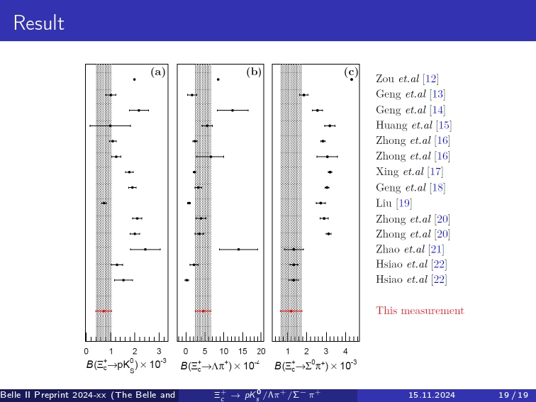 На Литературном семинаре МЛФЭЧ 25 октября 2024-го года стажер-исследователь ВШЭ Матвей Карибджанов выступил с обзором черновика статьи Belle «Measurement of the Branching Fraction of Λс -> pKsπ at Belle». Были рассмотрены возможные причины снятия цветоподавления канала Λс -> pKπ+ с внутренним изучением бозона, а также методы отбора событий и различные поправки. Были представлены результаты измерения отношения бранчингов каналов Λс -> pKsπ0 и Λс -> pKπ+, отношения амплитуд и разности фаз между амплитудами распада Λс -> NK; в конечные состояния с проекциями изоспина I=1,0. В результате обсуждения были сформулированы вопросы и комментарии, отправленные авторам статьи.